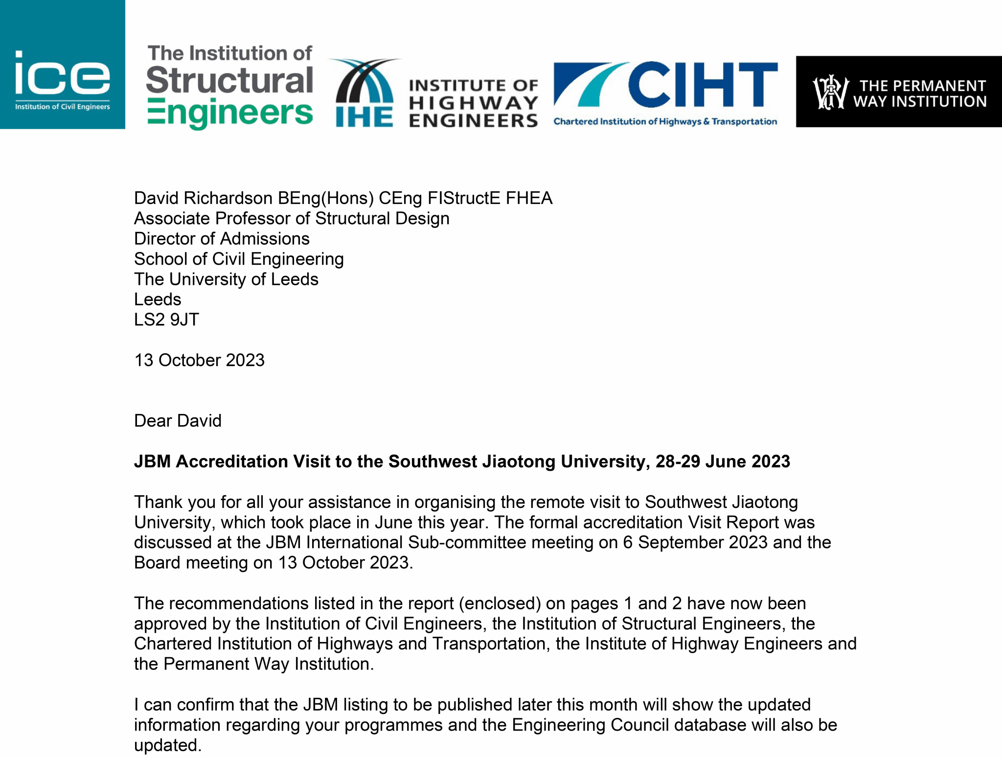 近期,英国工程委员会监督机构(Joint Board of Moderators,简称JBM)函告通知,太阳集团tyc234cc中外合作办学土木工程专业通过该机构的许可认证,这既是对我校中外合作办学土木工程专业教学质量和水平的高度认可,也是我校土木工程专业实力的有力证明,更为中外合作办学毕业生获取国际行业从业资格、参与国际竞争提供了有力保障。