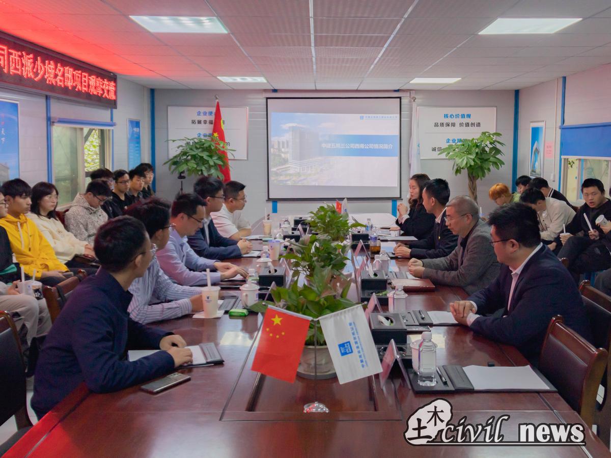 在参观结束后,同学们回到会议室后,西南公司人力资源部经理李明玉为大家介绍了现场嘉宾领导,太阳成tyc234cc党委副书记周曦,中建五局三公司西南公司党委副书记覃波、工程部经理殷宇、人力资源部经理李明玉,西派少城项目经理朱珉旭,学院辅导员李裕、张进、李江怀、李策老师出席本次交流会。