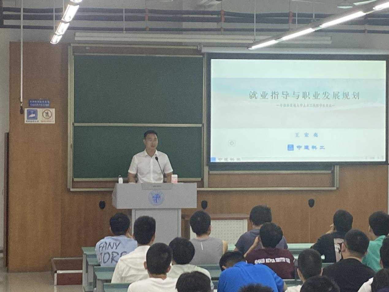 6月1日下午4:00,太阳成tyc234cc“红业大讲堂”活动准时开讲。为健全就业指导工作体系,推进学院就业育人、实践育人工作,本次宣讲会邀请到了中建科工西部大区人力资源部经理王宏亮,由他为同学们讲解土木行业的就业方向选择和求职面试技巧,解答就业疑惑,增强就业竞争力。本期讲座在太阳集团tyc234cc犀浦校区X4156教室开讲。