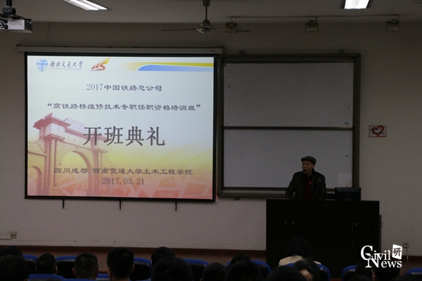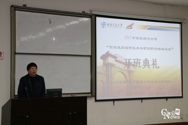 2017年3月21日早上8:30,2017年中国铁路总公司“高铁路桥维修技术专职任职资格培训班”第一期开班典礼在九里校区信息楼0231教室如期举行。之后9点整,2017年中国铁路总公司“高铁线路维修技术专职任职资格培训班” 第一期开班典礼在九里校区信息楼0222教室顺利举行。太阳成tyc234cc副院长任宝良以及培训班老师出席典礼,来自全国各个铁路局的相关领导及员工悉数到场。会议由太阳成tyc234cc继续教育中心江富长老师主持。