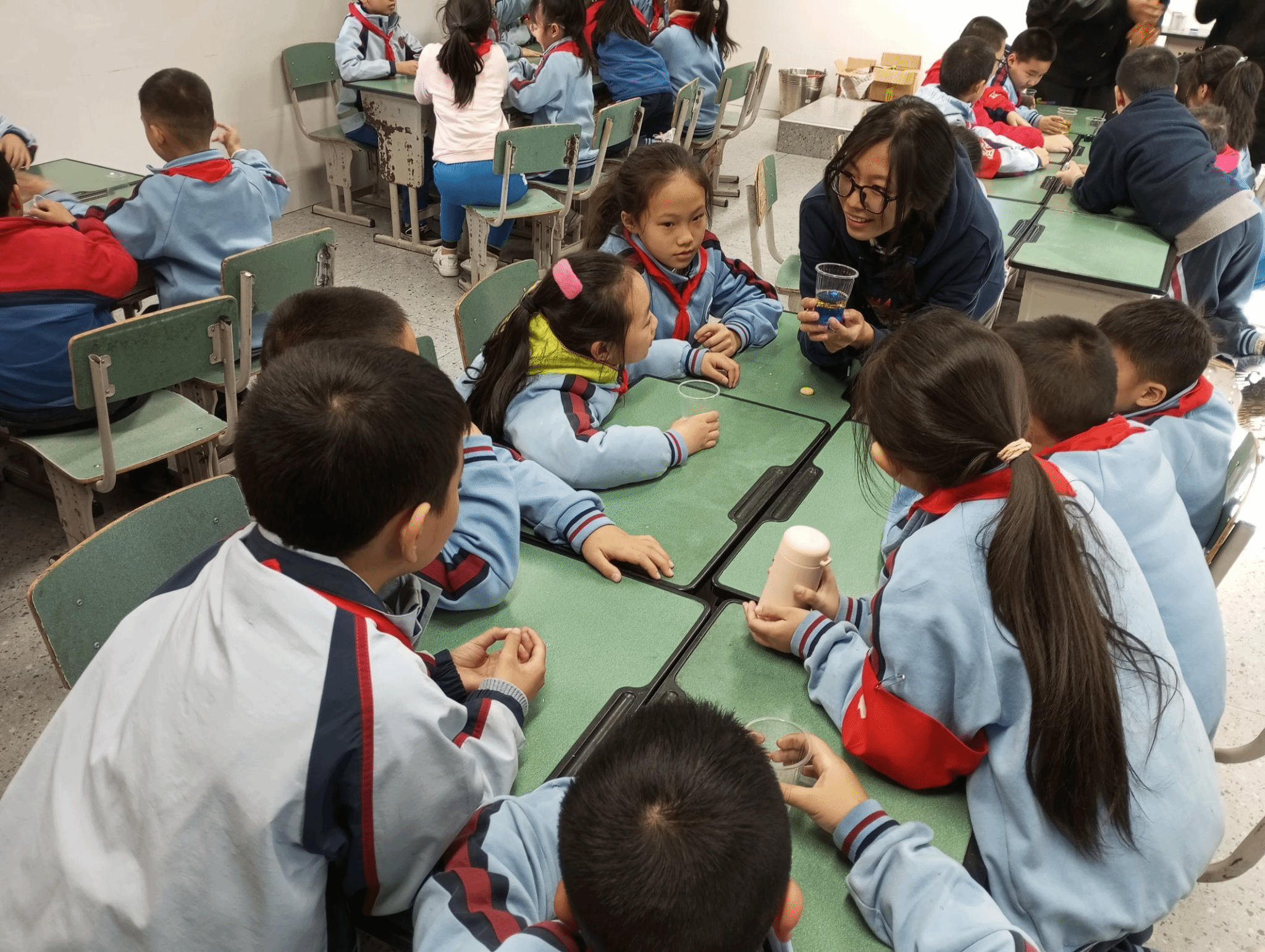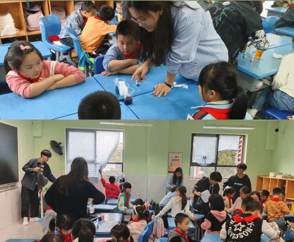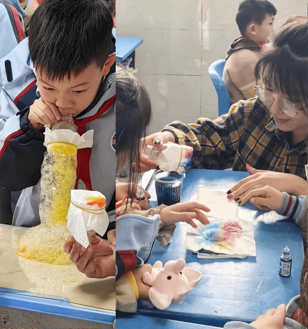 第二周的实验主题是熔岩等涉及分子变化的小实验。志愿者们准备了各种实验器材和材料,向孩子们展示了熔岩的制作过程和原理,以及其他一些有趣的分子现象。通过这些实验,志愿者们不仅让孩子们了解了分子的概念和特性,还培养了他们从宏观到微观观察和分析事物的思维方式,使孩子们能够感知到分子在自然界中的存在和作用。