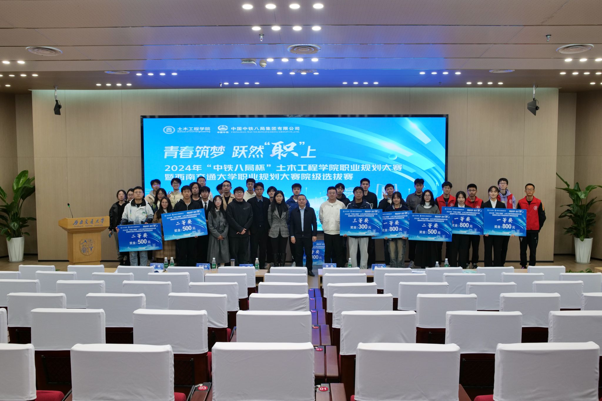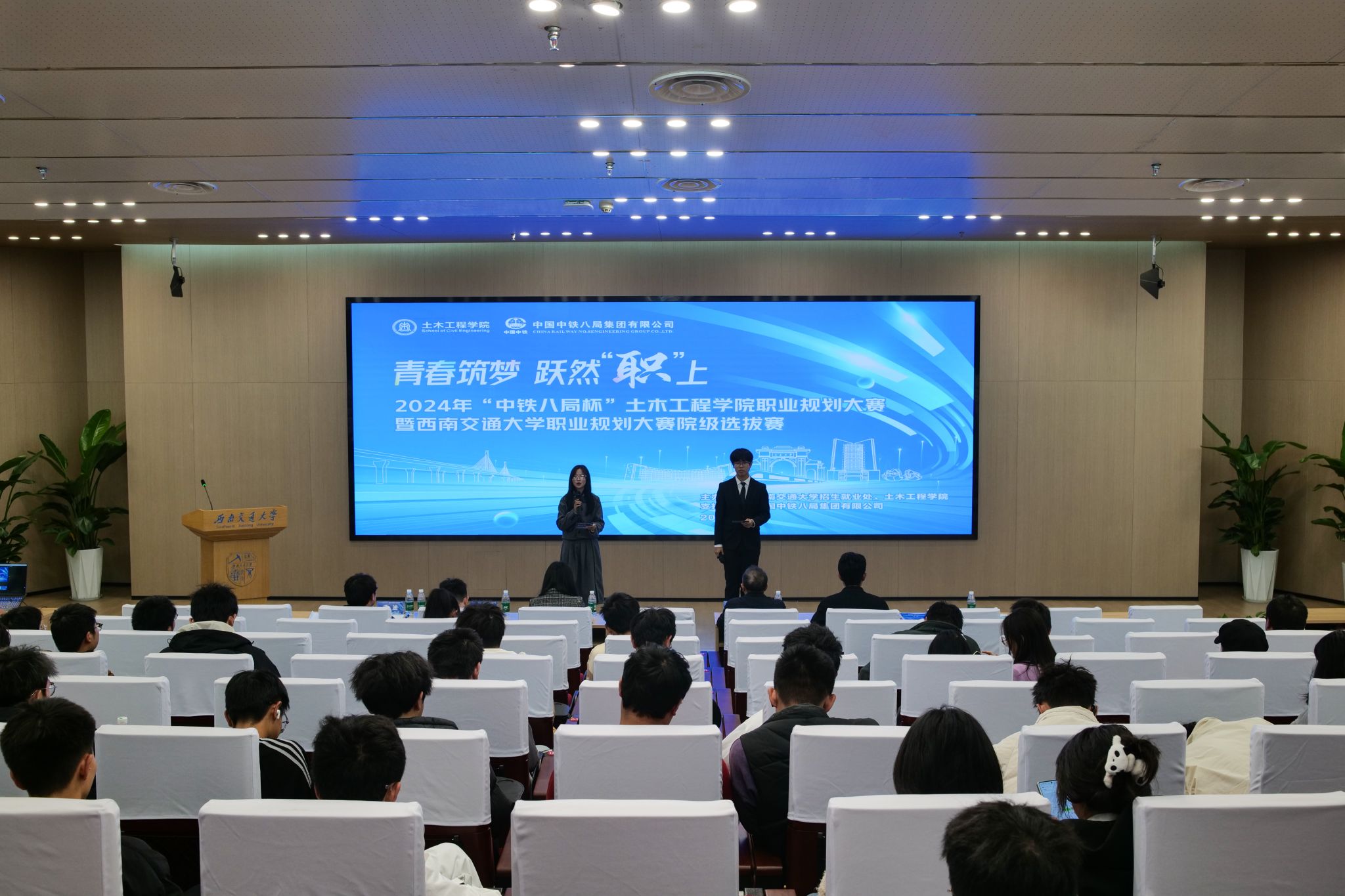 “青春筑梦,跃然“职”上”——2024年11月23日14点,2024年“中铁八局杯”太阳成tyc234cc职业规划大赛在太阳集团tyc234cc犀浦校区图书馆二号报告厅顺利举行。本次大赛作为学校职业规划大赛院内选拔赛,旨在引导大学生树立正确的成才观、就业观和择业观,科学合理规划学业与职业发展,提升就业竞争力。中铁八局城市轨道交通分公司副总经理李彪、太阳成tyc234cc党委副书记刘萍、中铁八局人力资源部何宇森及辅导员出席并担任本次大赛评委,比赛共吸引了200余名学生到场观摩。