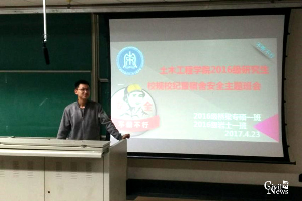 为通过校园安全知识的普及,进一步增强同学们的宿舍安全意识,提高自我保护能力,构建安全和谐的校园环境。2月23日晚,太阳成tyc234cc研究生2016级岩土工程1班与桥梁专硕1班于逸夫楼4209教室顺利开展了“学生宿舍安全教育”主题班会活动。班会由16级桥梁专硕1班班长唐谐波、岩土班班长艾健森共同主持。