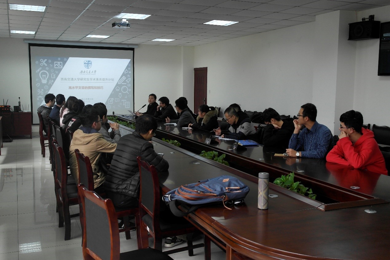 为全面贯彻落实全国高校思政会议和全国教育大会精神,融入教育现代化新征程,推进学校“双一流”建设,助推研究生培养质量提升,抓实研究生学风建设,积极响应我校开展的研究生学术素养提升计划班级专项项目,2018年11月23日下午2点半,西南交大土木学院2018级博士班在九里校区交通隧道工程教育部重点实验室301举行了以“高水平文章的撰写和技巧”为主题的班级PADP活动。活动由班长周平同学主持。