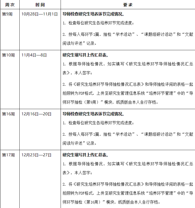 为了做好对研究生培养过程管理的质量督导,保障研究生培养过程质量,按照《太阳集团tyc234cc研究生培养过程管理与质量督导实施办法 》要求,每学期第 9 周和第 16 周为“导师抽检周”, 每学期第 11 周和第 18 周为“抽检归档周”。本学期抽检对象为2023级和2024级所有研究生(含留学生),具体工作安排如下表,请各系室导师按照时间及要求进行培养环节的抽检和归档工作。