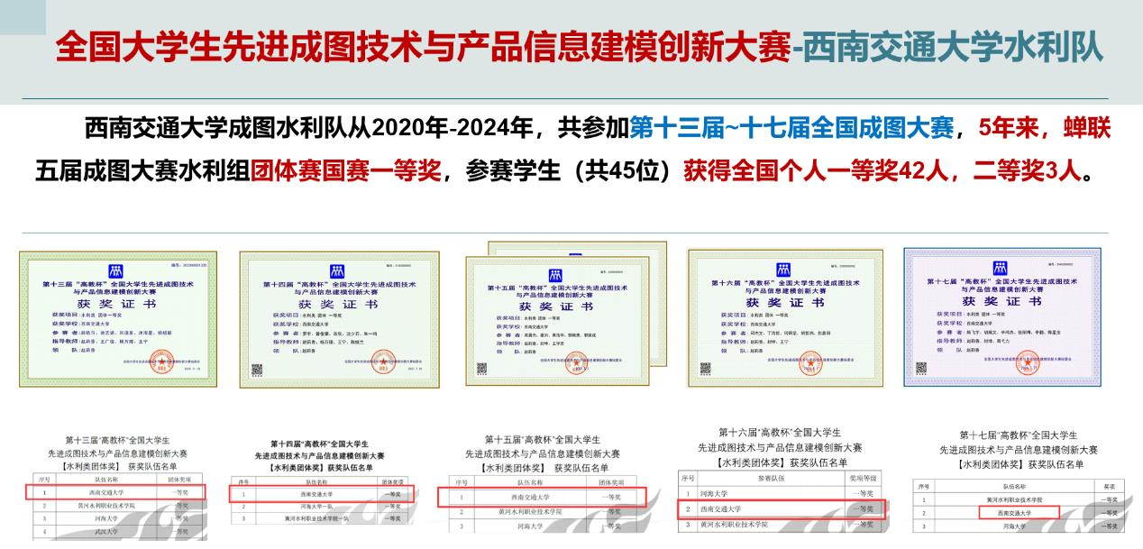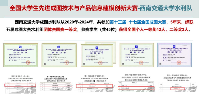 全国大学生先进成图技术与产品信息建模创新大赛是中国教育部及太阳集团tyc234cc认证的A类学科竞赛。太阳集团tyc234cc水利队连续参加了第十三至十七届先进成图大赛,成绩如下: