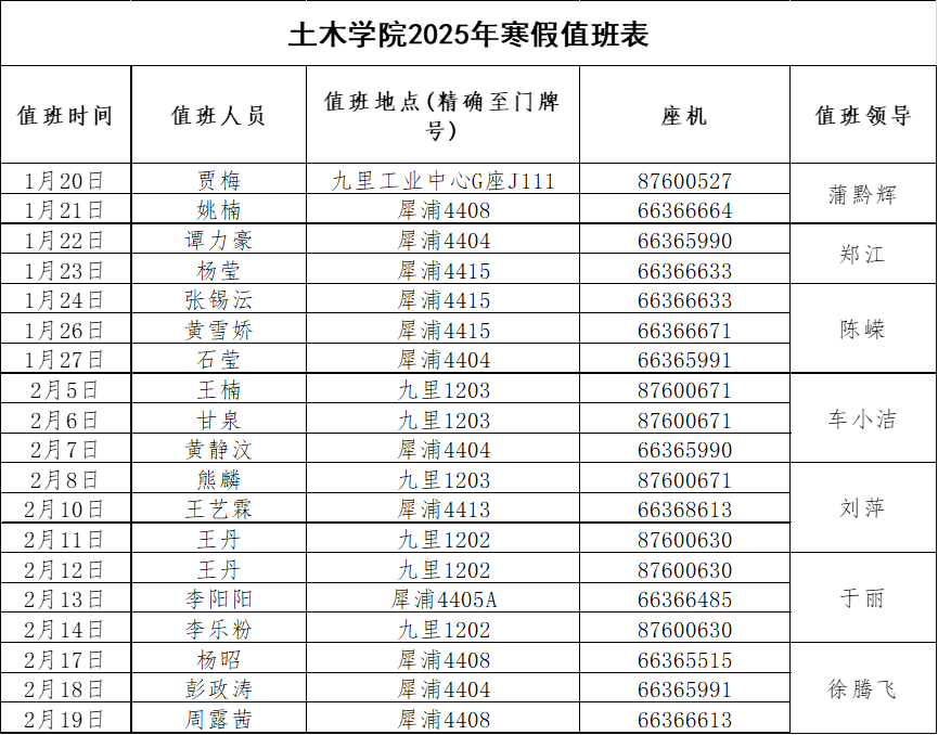 根据学校文件,教职工寒假起止时间为:2025 年1月20日(星期一)至2月19日(星期三),教职工于 2025 年2月20日(星期四)上班。本科生、研究生报到注册时间为:2025年2月22日 (星期六)、23日(星期日);2月24日(星期一)正式行课。本科生补考时间为:2025年2月20日(星期四)—2 月23日(星期日)。