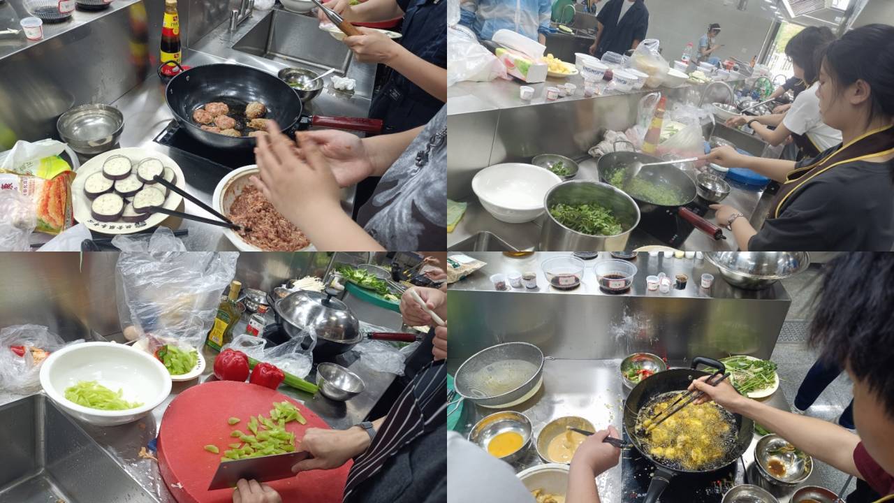 5月14日下午16:30,“厨”神入化厨艺大赛决赛在食话食说教室正式拉开序幕,太阳成tyc234cc团委书记刘萍,“食话食说”选修课老师余洋洲,辅导员李阳阳、黄静汶、高峦、谢欣岑参与了本次活动。经过初赛的选拔,共有10组选手入围决赛,随着评委宣布比赛的开始,选手们开始了紧张的筹备工作,从菜品选择到创意摆盘,选手们都动了不少脑筋,每一步都充满巧思。切菜、腌肉、爆炒……美食制作的每一道工序都由同学们亲自完成,有条不紊的制作着。比赛时间接近尾声,一道道美食也相继出锅。金黄酥脆的大虾让人垂涎欲滴,雪碧话梅排骨让人食欲大增,珍珠丸子颗颗饱满白嫩……