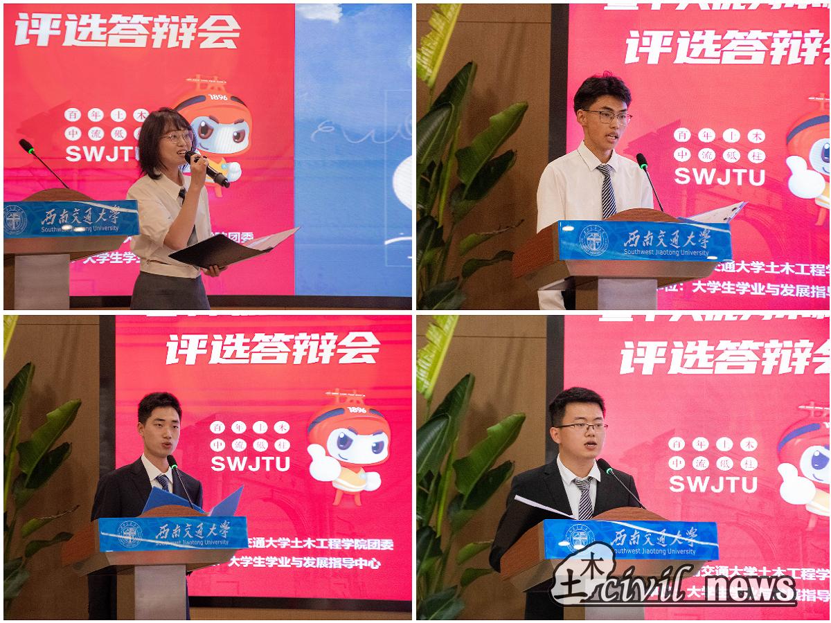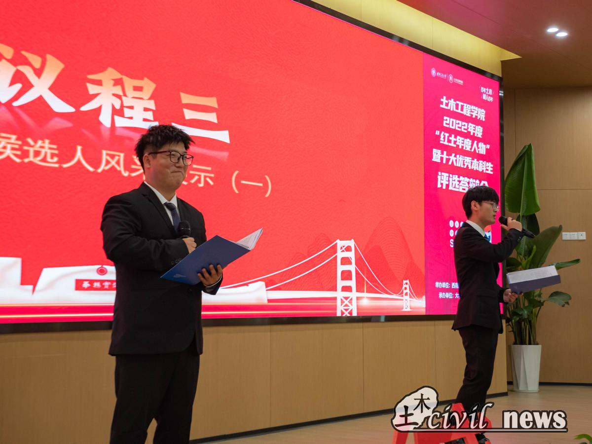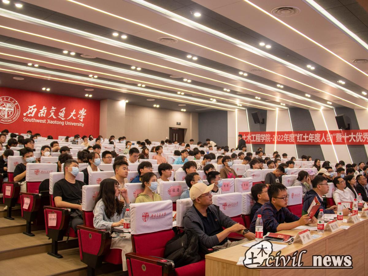 为总结经验,树立典型,发挥优秀学生的引领、示范作用,着力培养具有“红心”“红志”“红业”“红行”的“四红”土木人,2023年5月26日晚19:00,由太阳成tyc234cc学业与发展指导中心举行的2022红土年度人物暨十大优秀本科生评选答辩会于图书馆1号报告厅举行。出席本次评选会的嘉宾有:太阳成tyc234cc党委副书记周曦、学院团委书记刘萍、团委副书记石莹、学院实验教学中心的副主任张迅、土木2020-05班班导师曾艳华、土木2020-03班班导师郭春、土木2020-08班班导师李琼林、地下2020-03班班导师严健、土木(茅班)2020-01班班导师魏江涛、土木2020-19班班导师卫星以及学院辅导员老师们。