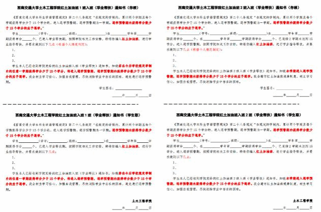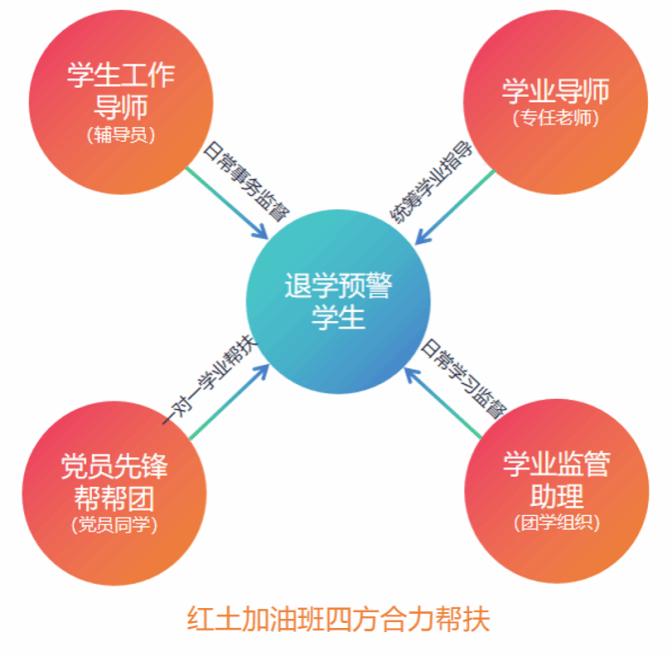 学院着重加强大一新生及退学预警学生学风监管与帮扶,特设红土加油班1班与2班。其中1班成员由一学期未到达15学分的大一学生组成,旨在提醒新生同学重视学业,帮助其尽早回到学习正轨;2班成员由本科阶段累计两学期未达到15学分、进入退学预警期的学生组成,旨在为这部分学生提供更全面的学业帮扶,帮助其克服学业困难。