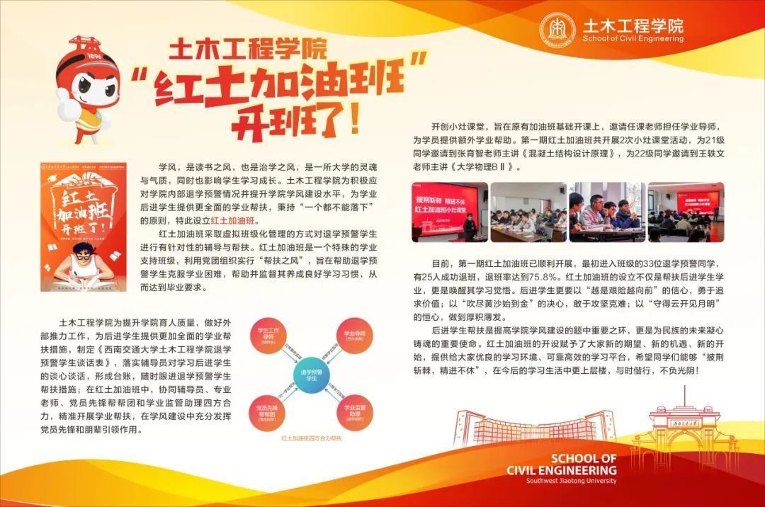 在一系列帮扶措施下,第一期红土加油班已于上学期顺利开展,最初进入班级的33位退学预警同学,有25人成功退班,退班率达到75.8%!红土加油班的 设立,不仅是帮扶后进学生解决学业困难,更是以唤醒学习觉悟与深挖学习动力为目的。总结第一期加油班中存在的优点与不足,汲取经验,优化细节,第二期红土加油班全新升级,强势归来!
