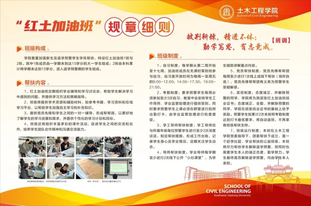 最值得一提的是,学院大力支持对于后进学生的帮扶与红土加油班的开设,为曾经虚拟化管理的红土加油班提供了定点教室!学院精心规划教室布局,添置32个自习座位供加油班成员静心学习;丰富文化墙建设,创建班级浓厚学习氛围;设计班级门牌及宣传画栏,在明确班规班训的同时增添班级归属感。