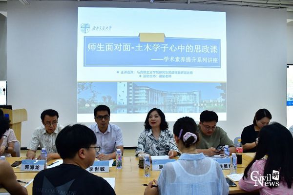 在师生互动环节中,老师们首先在现场随机抽选了12位研究生,邀请他们分享对经历过的思政课的看法。这些学生来自土木专业的不同方向,选择了不同老师的思政课,观点各异。学生表示,思政课不仅能够提升政治思想水平,更好地理解国家政策和社会发展,还能通过老师有趣的授课方式和课后积极的答疑互动,增加学习的趣味性和参与感;课堂上播放的有趣视频也丰富了课程内容,增强了学习的吸引力。一些学生认为,与本科时的思政课相比,研究生阶段的思政课不仅局限于书本知识,还会涉及如智能AI等课外内容,老师在授课时结合实际生活中的热门话题,更能引起学生的共鸣和深入思考。