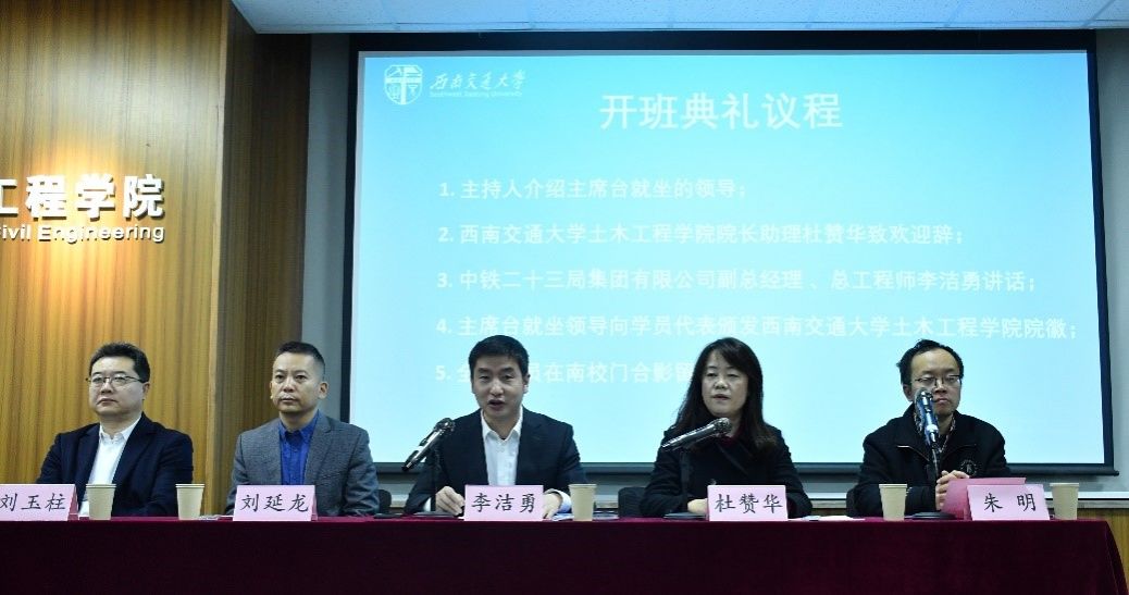 2024年1月15日上午8:20,中铁二十三局集团有限公司项目总工程师(房建专业)培训班开班典礼在九里校区土木馆举行。出席此次开班典礼的有中铁二十三局集团有限公司副总经理、总工程师李洁勇、中铁二十三局集团有限公司科学技术中心总经理刘延龙、中铁二十三局集团有限公司人力资源部经理刘玉柱、太阳成tyc234cc培训中心主任杜赞华,太阳成tyc234cc培训中心副主任朱明以及培训中心全位老师。开班典礼由我院培训中心副主任朱明老师主持。