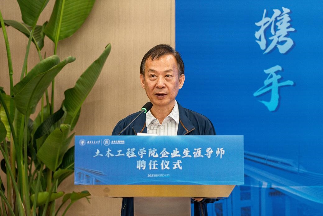 中交四航局第一工程有限公司党委组织部部长、人力资源部经理杜金作为企业生涯导师代表进行了发言。杜金校友首先感谢学校学院对企业生涯导师们的信任和支持,随后向在场师生分享了自己的导师工作经历,建议导师们要以“用心、用情、用力”六字作为今后的工作准则,对待学生要真情实意、要毫无保留,鼓励同学们要满怀信心,勇敢地进行职业生涯探索。