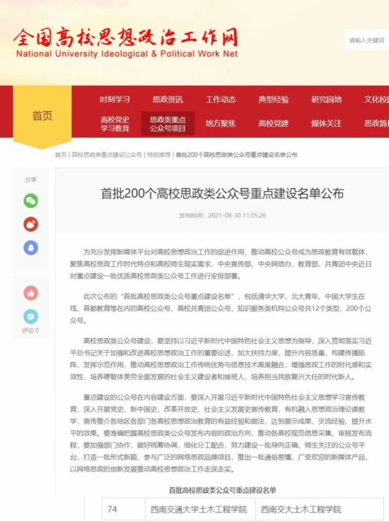 学院官微入选“全国首批200个高校思政类公众号”重点建设名单
