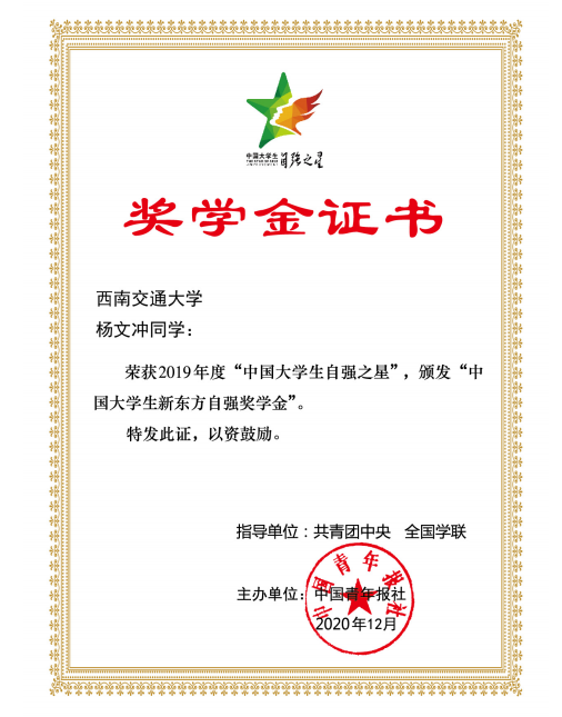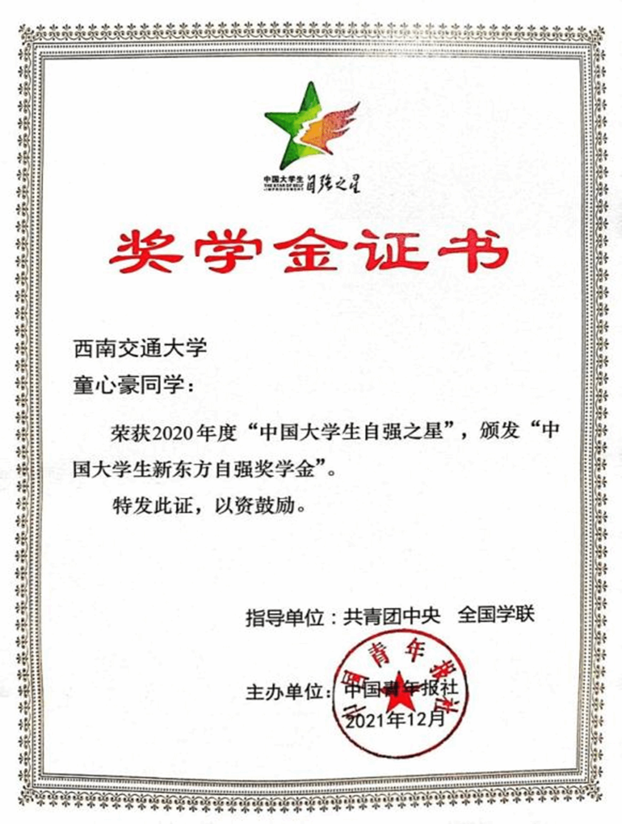 我院学生荣获“中国大学生自强之星”