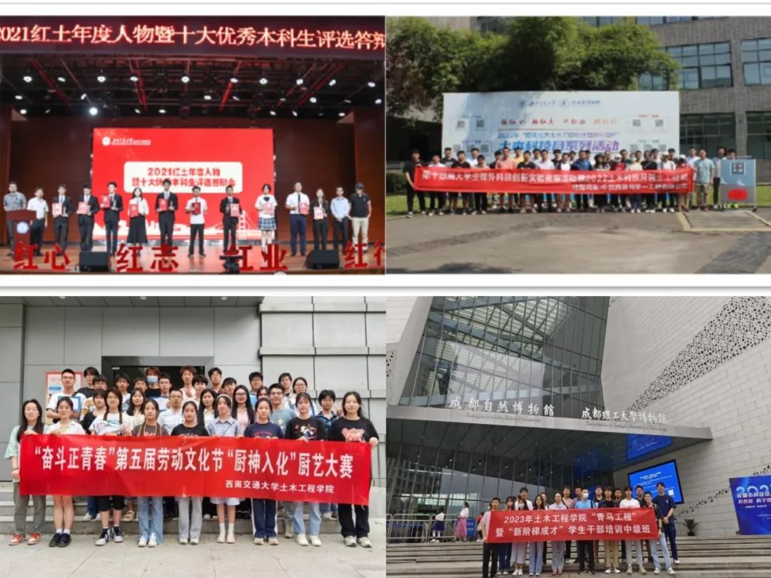 学院聚焦“四红”文化育人体系,不断推动学生工作改革创新发展,打造“红土党建+”、“树风·强风·清风”学风建设计划、“土木科技月”、“劳动文化节”、“新阶梯成才”等系列精品活动,有效提升学生综合素养,促进学生全面发展,服务学生成长成才,培养了一大批德才兼备的优秀人才,其中全国高校百名研究生党员标兵2人,“中国大学生年度人物”入围奖2人,中国大学生自强之星2人;四川省优秀毕业生150余人。