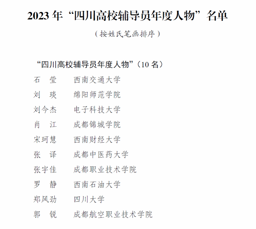 近日,由四川省教育厅主办的2023 年思政工作“年度人物”遴选结果揭晓,太阳成tyc234cc辅导员石莹老师获评“四川高校辅导员年度人物”。