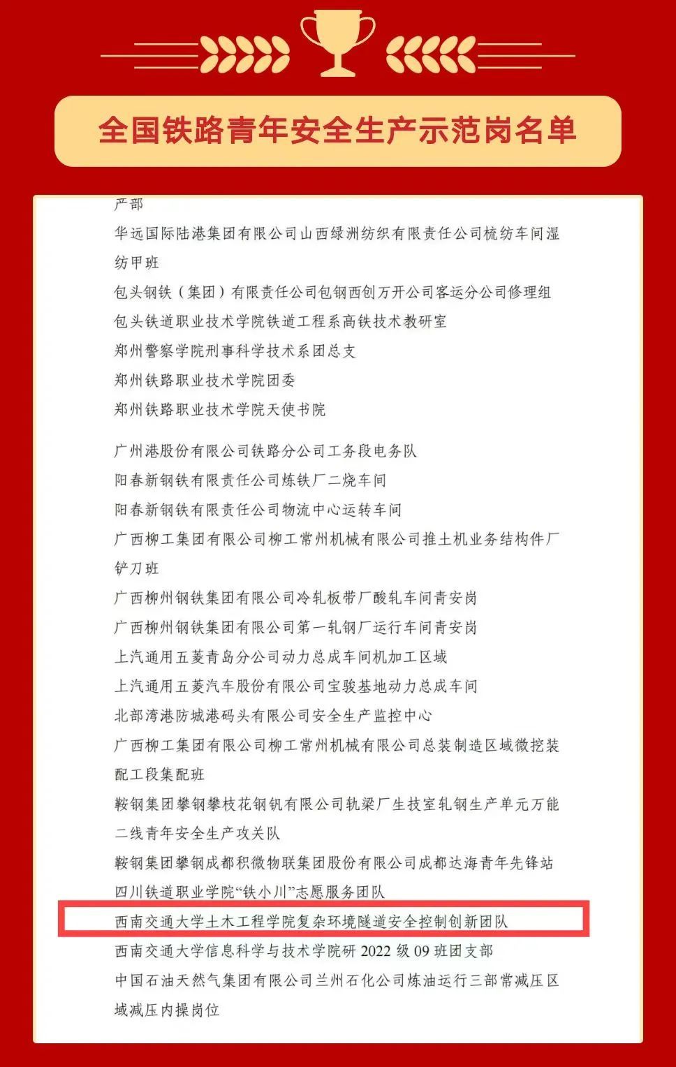 为树立典型,激励奋进,进一步促进青年成长成才,经全国铁道团委评审决定,太阳成tyc234cc复杂环境隧道安全控制创新团队荣获“全国铁路青年安全生产示范岗”。
