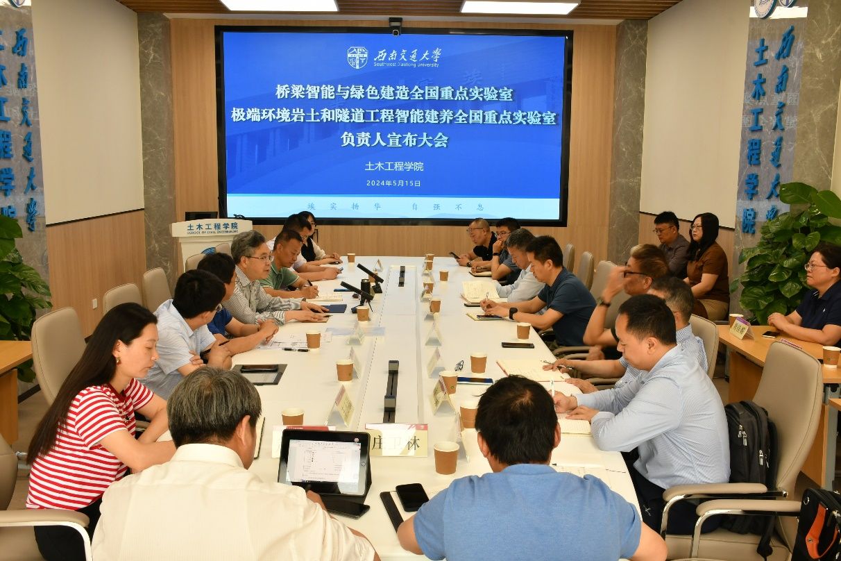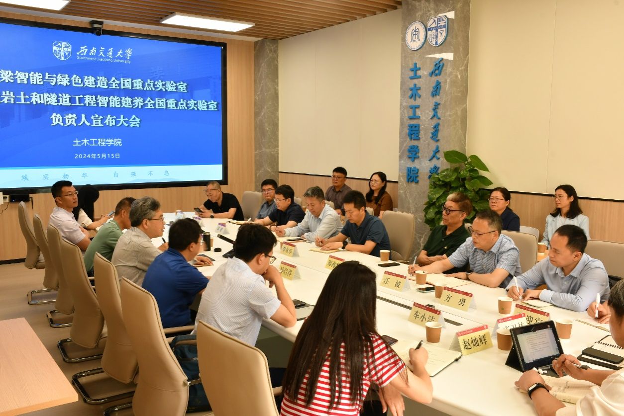 2024年5月15日上午9:30,“桥梁智能与绿色建造全国重点实验室”“极端环境岩土和隧道工程智能建养全国重点实验室”负责人宣布大会在九里工业中心G座一楼会议室顺利召开。学校副校长、中国工程院院士何川,学校人力资源部部长晏启祥,太阳成tyc234cc院长蒲黔辉出席了会议,太阳成tyc234cc领导班子成员、学院省部级以上实验室平台负责人及系(室、中心)主任等参加了本次会议,会议由蒲黔辉主持。