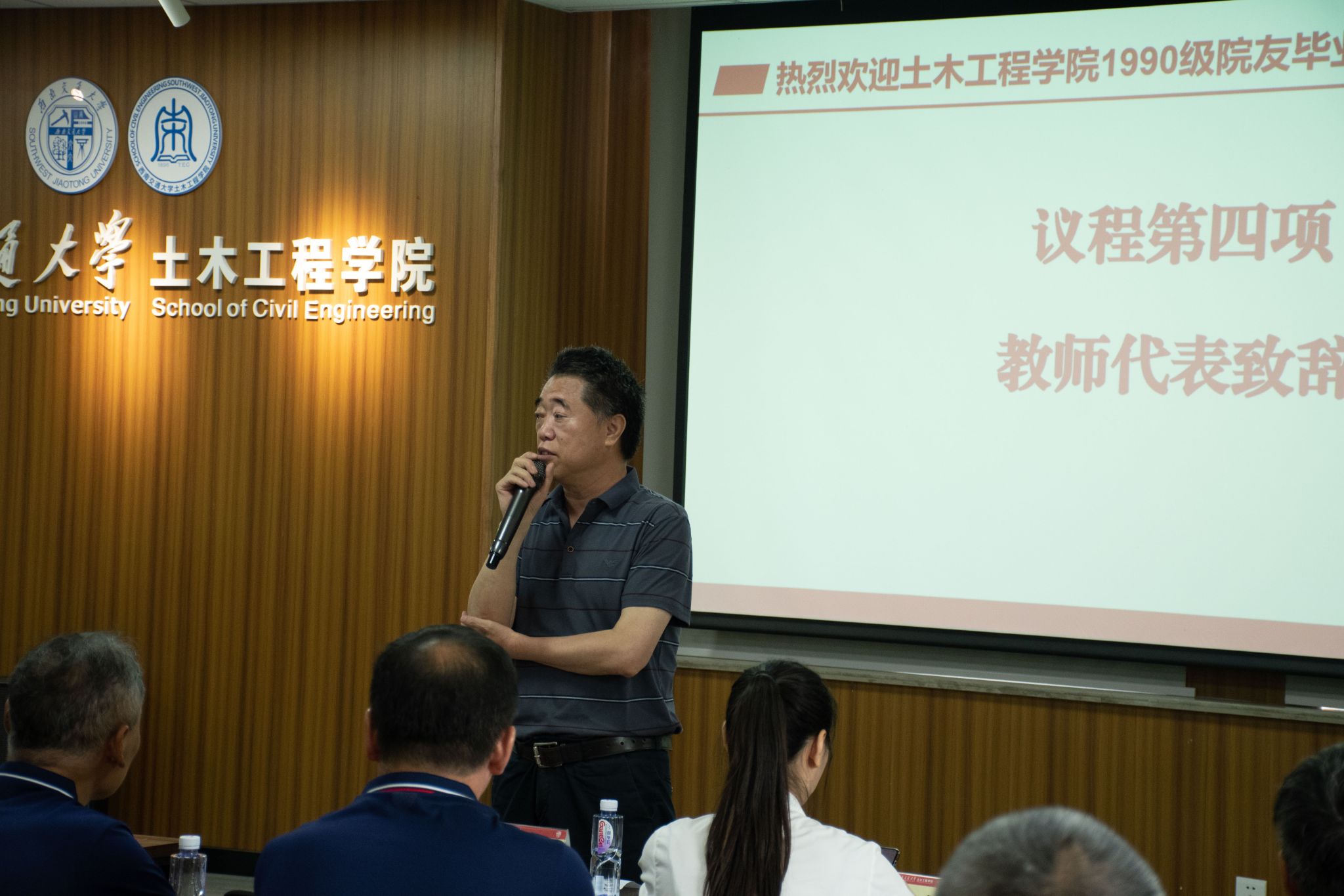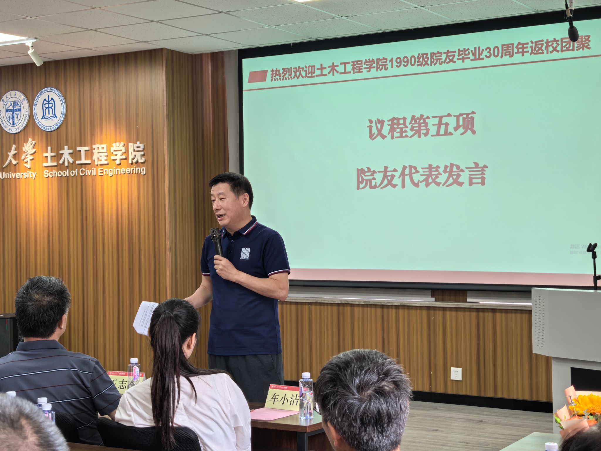 1990级教师代表王志杰老师也作了精彩发言。他回忆起与在座学生们一起打球运动的美好时光,为院友们返校团聚表示热烈欢迎,也对院友们支持学校学院工作表达了感谢之情。同时,他着重强调了加强校友联系工作的重要性,希望能够更好地服务校友、联络感情,增强西南交大土木校友的身份认同感,促进学校与校友、校友与校友之间的合作发展,也希望校友们能够关注学校的发展,并鼓励大家继续为土木专业的发展做出贡献。