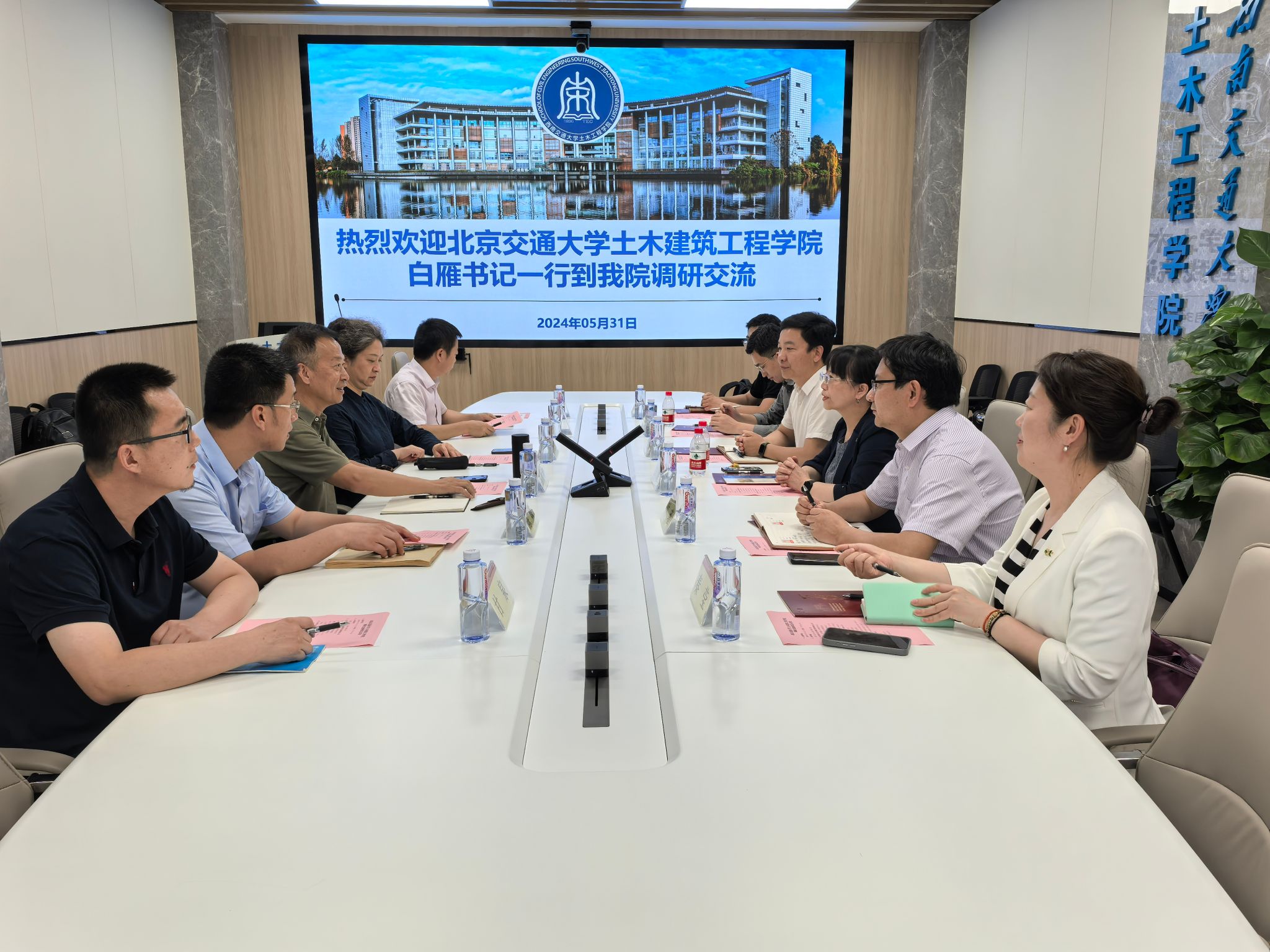 为加强校际交流合作,促进共同发展,2024年5月31日,北京交通大学土木建筑工程学院党委书记白雁、副院长时瑾、副院长解会兵一行6人到我院进行调研交流。