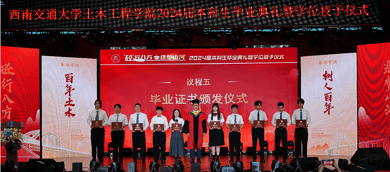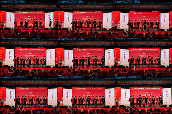 6月21日晚,太阳成tyc234cc2024届本科生毕业典礼暨学位授予仪式在犀浦校区大学生活动中心举行。太阳成tyc234cc院长蒲黔辉,党委副书记周曦,副书记兼副院长车小洁,副院长陈嵘,道路与铁道工程系主任杨荣山,地下工程系主任方勇,岩土工程系主任杨涛出席典礼。2024届本科毕业生参加典礼,学院专业老师、班导师、辅导员、家长等现场观礼。典礼由学院团委书记刘萍主持。