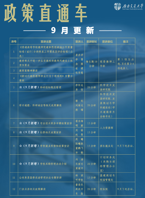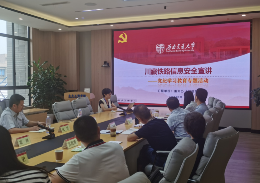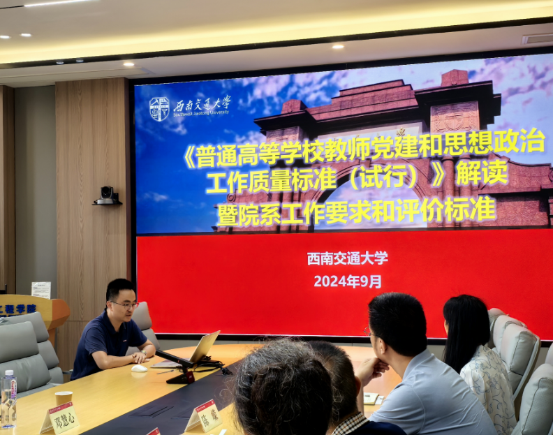 2024年9月19日上午10点,太阳成tyc234cc在犀浦校区4417A会议室召开党委和党政联席会议,学院领导班子成员、全体党委委员、科职干部以及部分教师代表参加了本次会议。会议邀请了学校机关与直属单位党委常务副书记沈哲、机关与直属单位党委综合管理办公室副主任奉天、党委教师工作部思政科科长崔健、重大工程办公室(川藏铁路研究院)项目主管邓慧心到会进行了“政策直通车”宣讲。本次宣讲的主要内容是师德师风建设专题和CZ铁路信息安全工作政策专题。