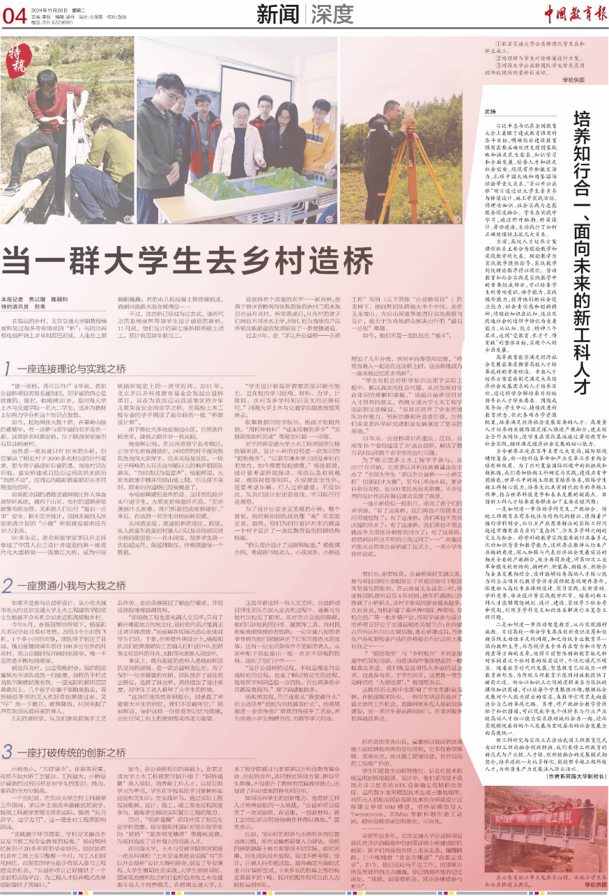 如今,在公益桥项目的基础上,北京交通大学土木工程建筑学院升级了“织桥通衢”育人项目,培养新工科人才。以项目制学习为牵引,学生在学校系统学习掌握桥梁建设相关知识;在实践环节,通过实际工程现场勘测、设计、施工、竣工等全过程深度参与,锻炼学生解决实际复杂工程的能力。