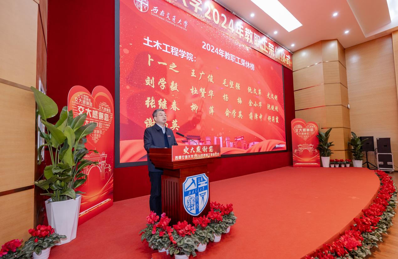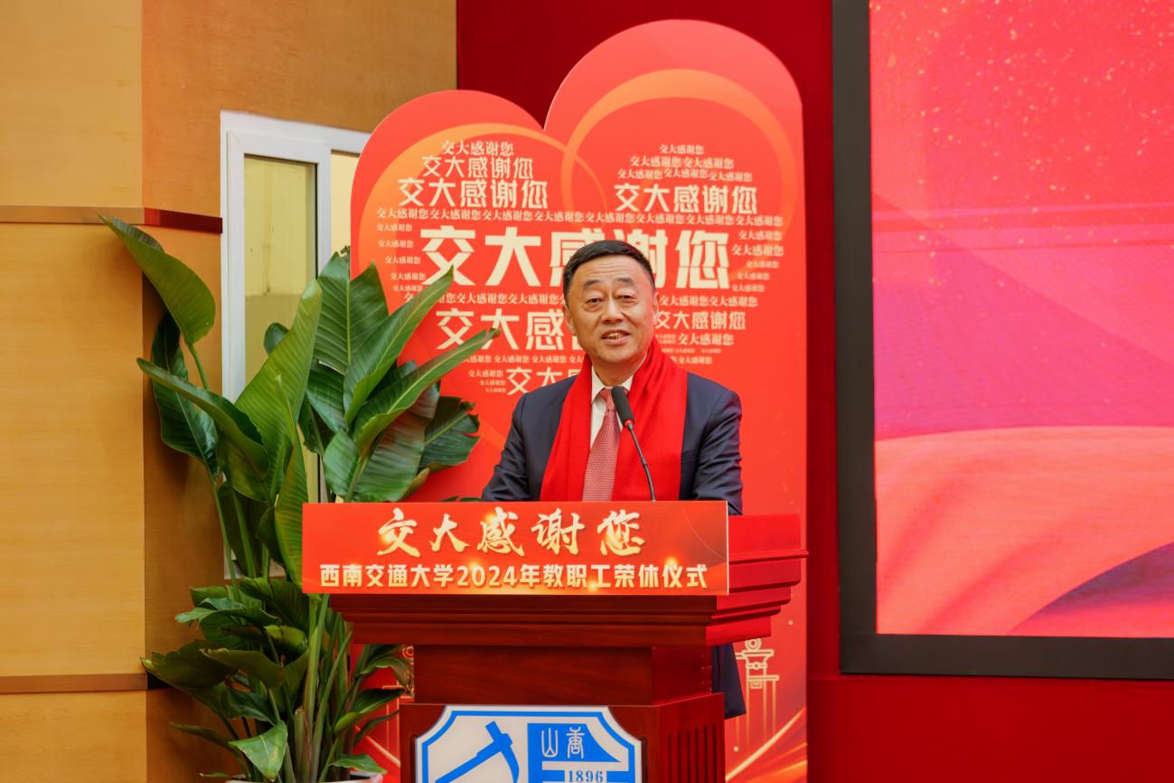 我院仇文革教授作为荣休教职工代表作了《燃尽最后一滴蜡烛,给隧道增添光明》的发言。他深情回顾了在交大求学和工作的峥嵘岁月,毕业留校后,他响应学院号召,奔赴衡广复线大瑶山隧道建设一线,在那里,他找到了自己的信念:再好的实验室也赶不上工地,要用双脚做学问。直到今天,仇文革教授仍每年奔赴工地几十次,继续发挥余热。最后仇教授寄语母校寄语未来,在这个中华民族伟大复兴和百年未有之大变局的时代,在这个科技日新月异,AI飞速发展的时代,在地壳中修建经纬纵横的隧道网络“环球地铁-Global metro”不是梦想。交大人要凝心聚力奋发有为,再创百年辉煌!在发言结束时,仇教授隔空“比心”,并喊话“I love you交大!”,表达了对交大的感激之情和美好祝愿。