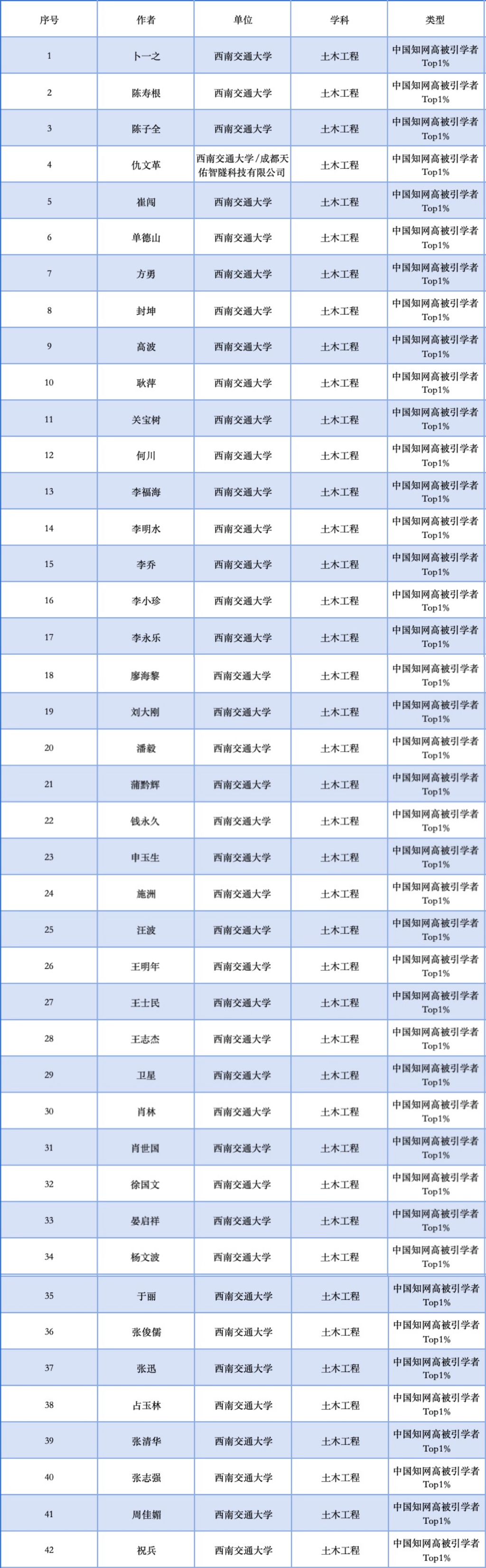 近日,中国知网中国科学文献计量评价研究中心基于中国知网收录的国内学术期刊论文和会议论文,2024年首次开展学者学术影响力客观评价,遴选了“2024中国知网高被引学者”名单,助力优秀成果的国内首发。经过定量数据统计、遴选方案评审、学科专家调研等前期筹备工作,我院42名学者入选2024年度中国知网土木工程学科高被引学者Top1%。