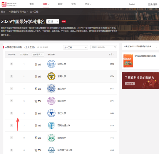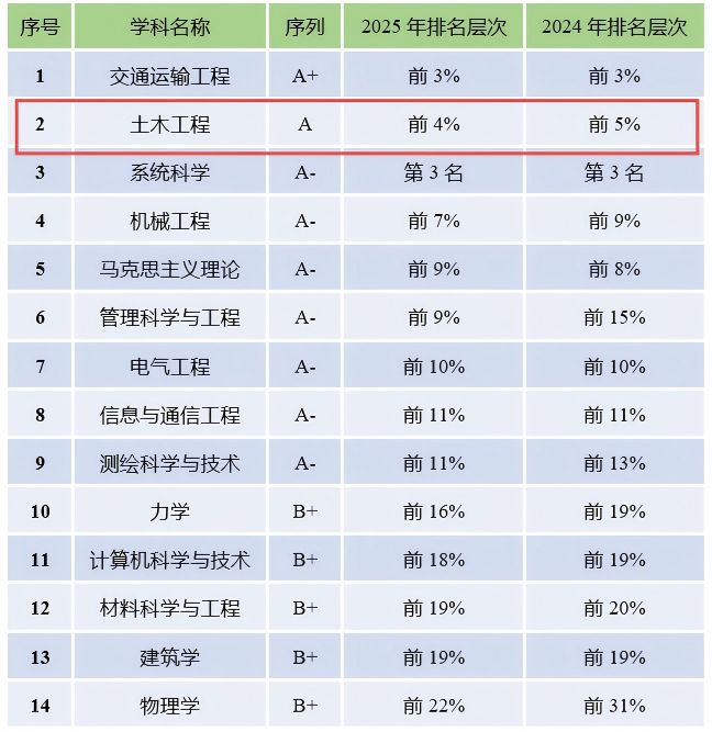 近日,高等教育评价机构软科正式发布“2025软科中国最好学科排名”。太阳集团tyc234cc“土木工程”学科从2024年的全国第7位攀升至第6位,稳居A类,跻身全国前4%!