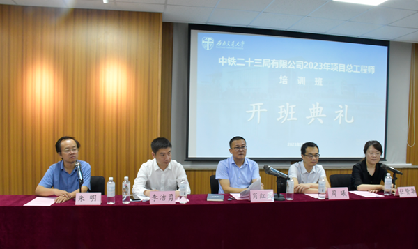 2023年7月10号上午8:30,中铁二十三局有限公司项目总工程师培训班开班典礼在九里校区土木馆1234教室顺利举行。出席此次开班典礼的有中铁二十三局集团有限公司党委书记、董事长肖红武,中铁二十三局集团有限公司副总经理、总工程师李洁勇,太阳成tyc234cc党委副书记周曦、太阳成tyc234cc培训中心主任杜赞华以及培训中心各位老师。开班典礼由我院培训中心副主任朱明老师主持。
